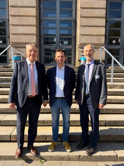 Im Rahmen des Festakts am Institut gratulierte auch efzn-Vorstandssprecher Prof. Dr. Sebastian Lehnhoff zum elenia-Jubiläum und beleuchtete wichtige Meilensteine der Zusammenarbeit im efzn. Im Bild: Prof. Dr.-Ing. Bernd Engel, Prof. Dr. Sebastian Lehnhoff und Prof. Dr.-Ing. Michael Kurrat. Foto: © Magdalena Pape, elenia Institut.